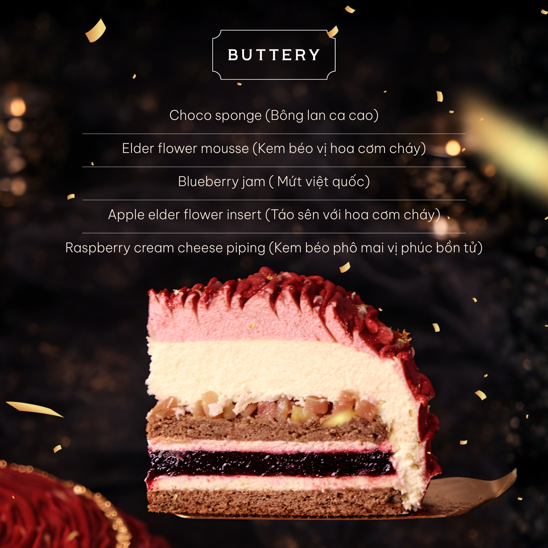 Bông lan ca cao mềm ẩm kết hợp mousse hoa cơm cháy thanh tao, điểm mứt việt quất và táo sên hoa cơm cháy tinh tế.Hoàn thiện với kem phô...